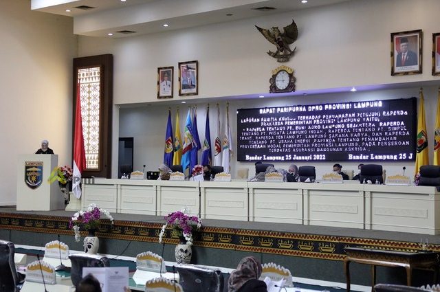 Adapun ke tujuh Raperda yang telah disetujui menjadi Perda tersebut yaitu Raperda tentang PT Bumi Agro Lampung Sejahtera, PT Wisata Lampung Indah, PT Simpul Trans Lampung, PT Lampung Sarana Karya dan PT Lampung Usaha Energi.