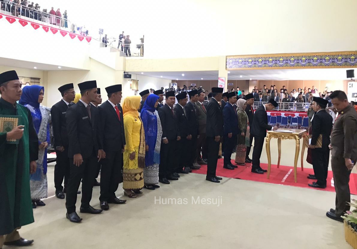 Plt Bupati Mesuji Saply TH membacakan sambutan tertulis Gubernur Lampung mengatakan pelantikan dan pengambilan sumpah/janji anggota DPRD Kabupaten Mesuji merupakan puncak dari seluruh tahapan pelaksanaan Pemilihan Umum yang telah sukses digelar serentak pada 17 April 2019 lalu.