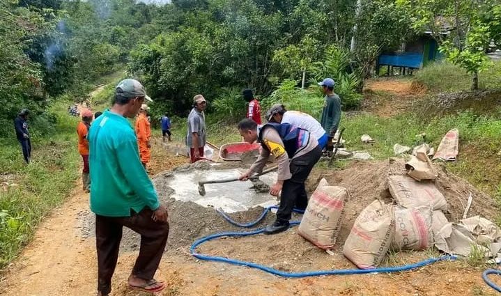 Bhabinkamtibmas Desa Bahitom Briptu Tri Oktapianor bersama anggota BPD dan masyarakat setempat karja bakti memperbaiki jalan rusak menuju Trans Bahitom, Kabupaten Murung Raya, Provinsi Kalimantan Tengah, Sabtu kemarin