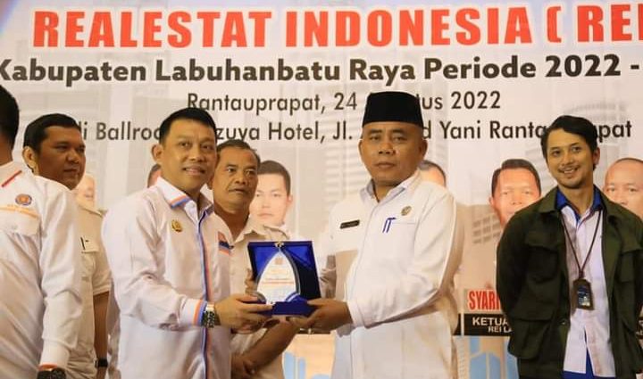 Labuhanbatu, (Pena Berlian Online) – Bupati Labuhanbatu dr H Erik Adtarada Ritonga, M.KM diwakili Staf Ahli Bupati Ir H Jumingan menghadiri pelantikan pengurus REALESTAT INDONESIA (REI) Komisariat Kabupaten Labuhanbatu dan Kabupaten Labuhanbatu Selatan periode 2022 – 2024, di Ballroom Suzuya Hotel, Jalan Ahmad Yani Rantau prapat. Rabu (24/08/2022).