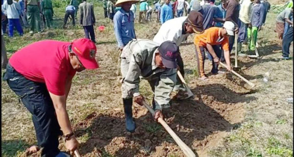 Lampung Tengah, (PENA BERLIAN ONLINE) – Dorong percepatan pembangunan di Lampung Tengah, bersama warga Kampung Bumi Kencana, Kecamatan Seputih Agung, Bupati Lamteng Loekman Djoyosoemarto melaksanakan kegiatan gotong royong buka akses jalan antar Dusun.