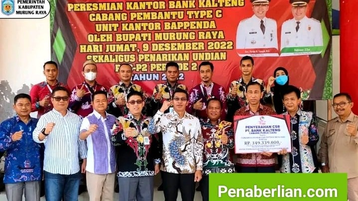 Murung Raya,(Pena Berlia Online) Bupati Murung Raya (Mura) Perdie M Yoseph meresmikan kantor Bank Kalteng cabang Pembantu Type C unit Kantor Bappenda sekaligus penarikan undian PBB P2 periode 2 tahun 2022. Hadir dalam acara perwakilan Direksi PT.Bank Kalteng Palangka Raya Yulianson, Pemimpin Bank Kalteng cabang Puruk Cahu Ernan Kurniato, sejumlah kepala dinas, jajaran Bank Kalteng Puruk Cahu serta undangan lainnya, Jumat (9/12/2022).