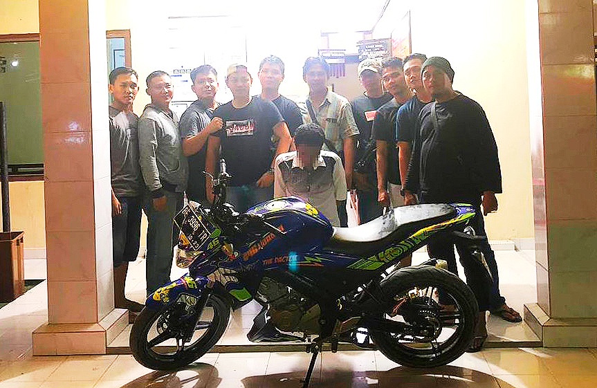 Masih kata Kapolsek, berbekal laporan dari korban, petugas kami bersama tekab 308 Polres melakukan penyelidikan untuk mencari tahu siapa pelakunya. Berkat keuletan dan kegigihan petugas di lapangan, akhirnya pelaku berikut BB (barang bukti) sepeda motor Yamaha New Vixion tahun 2018, warna biru, BE 3996 TR berhasil diungkap.