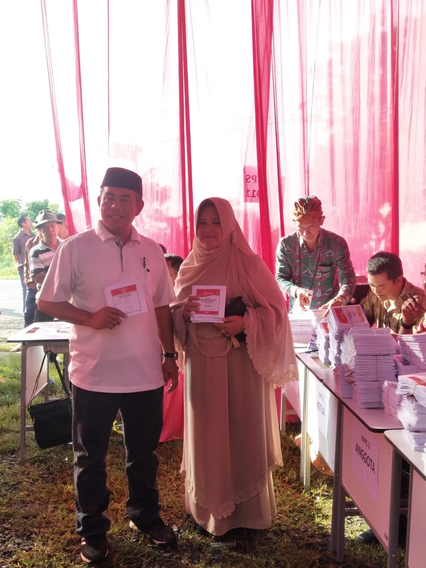 Blambangan Umpu (PBO) — Bustami Zainudin Bupati Way Kanan periode 2010-2015 mulang tiyuh didampingi Istri Rina Bustami mendatangi TPS 11 Kelurahan Blambangan Umpu Kecamatan Blambangan Umpu Kabupaten Way Kanan untuk menggunakan hak pilihnya di pemilu 2019 ini. Rabu (17/4/2019)