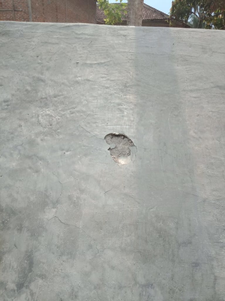Sementara itu, sistem adukan plesteran yang tidak rata dan diaci dengan acian kuas maka saat kering permukaan yang tidak padat pasti terkelupas atau amblas ngebolong, dan ini terlihat pada sebagian bangunan yang ada dilokasi.