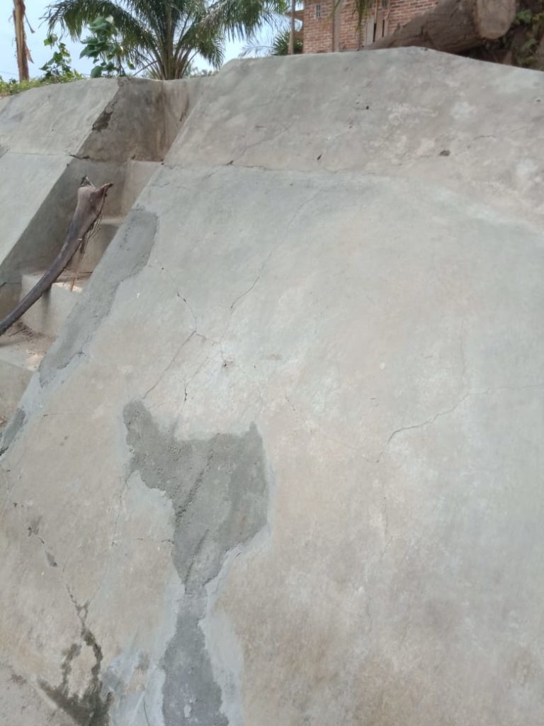 “Terlihat secara jelas bahwa pasangan batu dinding talud pecah diakibatkan tekanan tanah dan kondisi setruktur pengerjaan dinding talud yang diduga pasangan batu pondasi talud kurang memenuhi persyaratan teknis dan pemasangan batu dinding talud kurabg adukan makanya retak kena bila hanya batu yang disusun merebah di dinding tanah tebing bangunan dan hanya diberi adukan dimuka pasangan batu lalu diplester dan di aci maka pasti pasangan batu yang disusun tidak akan bisa menahan gaya geser dan tekan tanah,”ungkap narasumber.