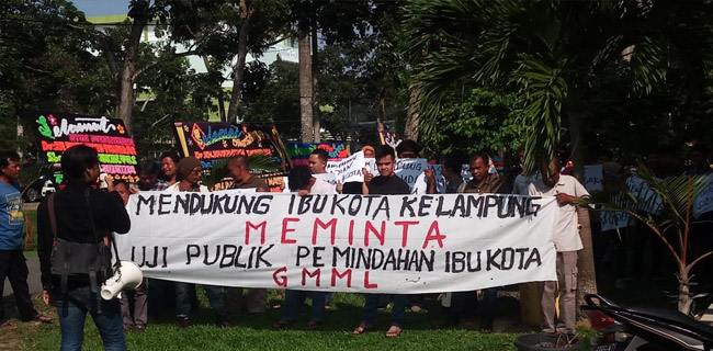 Gerakan Masyarakat dan Mahasiswa Lampung (GMML) berorasi sambil membentangkan spanduk bertuliskan: Mendukung Ibu Kota Ke Lampung, Meminta Uji Publik Pemindahan Ibu Kota.