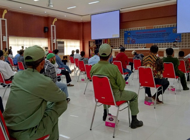 Bandar Lampung, (Pena Berlian Online) Sejumlah anggota Satuan Perlindungan Masyarakat (Satlinmas) di lingkungan Kota Bandar mengikuti penyuluhan sadar hukum politik uang yang difasilitasi segenap akademisi Universitas Lampung, Selasa (8/9).