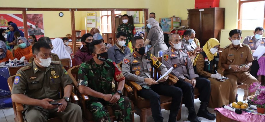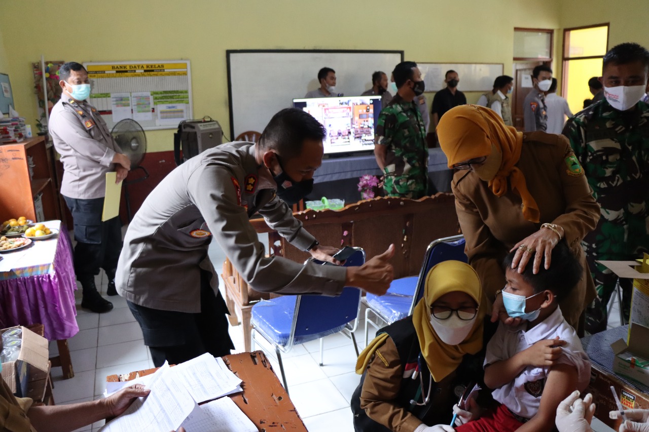 Kuningan, (PBO)- Kapolres Kuningan AKBP Dhany Aryanda meninjau langsung kegiatan vaksinasi untuk anak yang dilakukan oleh Gerai Vaksin Polsek Kadugede bekerja sama dengan UPTD Puskesmas Kadugede di SDN 1 Ciherang Kecamatan Kadugede Kabupaten Kuningan, Selasa (15/3/2022).