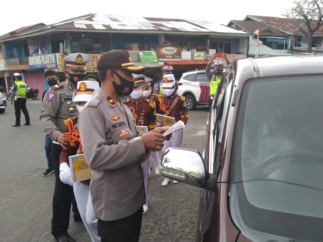 Lampung Barat, (Pena Berlian Online)-Kapolres Lampung Barat AKBP Rachmat Tri Haryadi,S.IK.,M.H. memimpin langsung kegiatan Operasi Zebra Krakatau 2020 dengan membagikan 500 Masker, 500 Vitamin, 150 Bunga dan tabungan harian anak-anak di Tugu Liwa, Kecamatan Balik Bukit, Kabupaten Lampung Barat pada Senin 02/11/2020.
