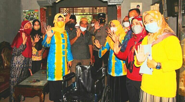 Metro (PBO)– Ketua TP-PKK Kota Metro, Silfia Naharani memberikan bantuan kursi roda kepada Susilawati, penderita penyakit rhematoid artritis kronis.