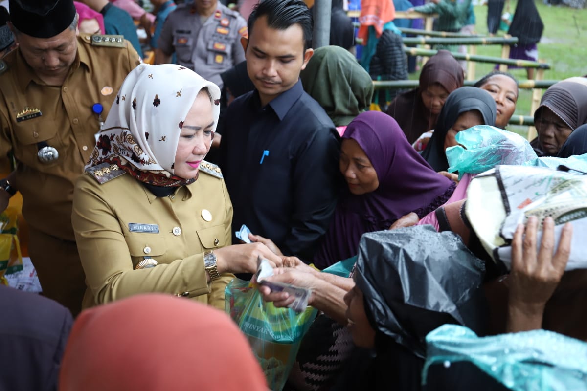 Tulang Bawang (PBO) – Meski dalam kondisi cuaca hujan deras, antusiasme warga saat gelaran pasar murah ramadhan 1440 Hijriah yang digelar tidak sedikitpun surut, hal ini membuat Bupati Tulangbawang Hj. Winarti SE MH nampak terharu, Senin (20/05/2019).