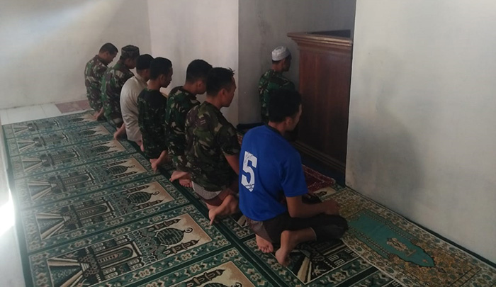 Terlihat barisan saf Salat berjamaah di masjid setempat. Meskipun masih dalam proses pembangunam masjid tetap dilakukan untuk ibadah. Bahkan warga sekitar juga menggunakannya untuk beribadah sehari hari. Karena Masjid itu merupakan satu-satunya masjid terdekat yang bisa digunakan untuk ibadah setiap hari. Bahkan terdekat dari Posko Satgas TMMD yang ada.