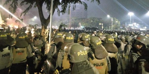 Sebelumnya, terjadi lemparan dari kerumunan massa yang berada di depan Istana Merdeka, Jalan Medan Merdeka Utara. Mereka melempar botol dan sejumlah kembang api ke arah polisi yang berjaga.