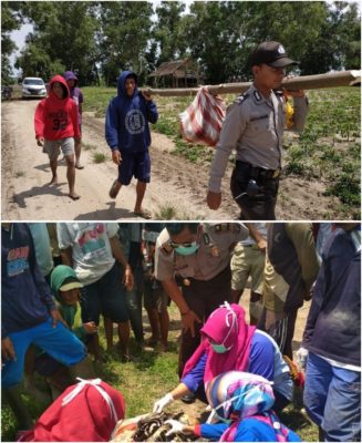 Saat tiba di TKP, petugas menemukan BB (barang bukti) berupa peci warna hitam, kaos oblong warna putih kusam dan celana pendek warna hijau.