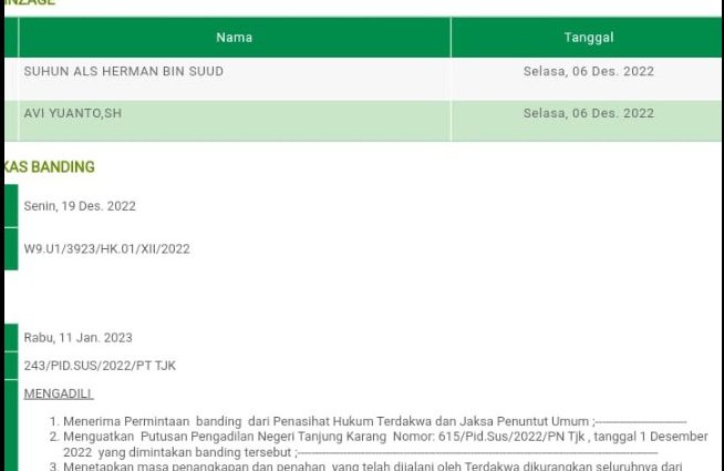 Pada amar putusan di SIPP PN Tanjung Karang tersebut tertulis dengan Amar Bebas tertanggal 11 Januari 2023 dan di upload tgl 12 Januari 2023, pada hari Sabtu tgl 14 Januari 2023, amar putusan berubah menjadi menguatkan putusan PN Tanjung Karang dengan pidana penjara selama 20 tahun.