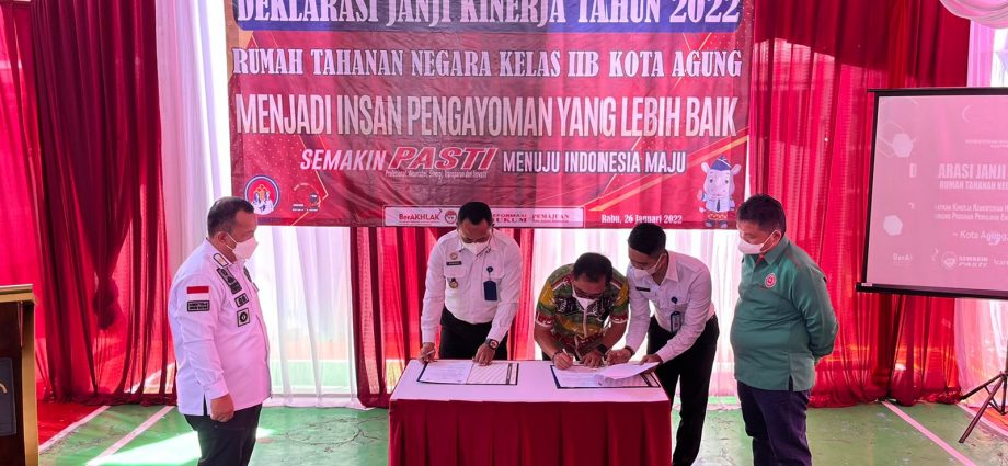 Tanggamus (PBO) – Dalam rangka mewujudkan satuan kerja yang berpredikat Wilayah Bebas dari Korupsi (WBK) dan Wilayah Birokrasi Bersih dan Melayani (WBBM), Rumah Tahanan Negara (Rutan) Kelas IIB Kota Agung menggelar Deklarasi Janji Kinerja dan Penandatangan Komitmen Bersama Pencanangan Pembangunan Zona Integritas (ZI) Menuju WBK/WBBM Tahun 2022 dengan tema Kemenkumham Semakin Pasti dan Berakhlak Menuju Indonesia Maju, (Rabu, 26/1/22).
