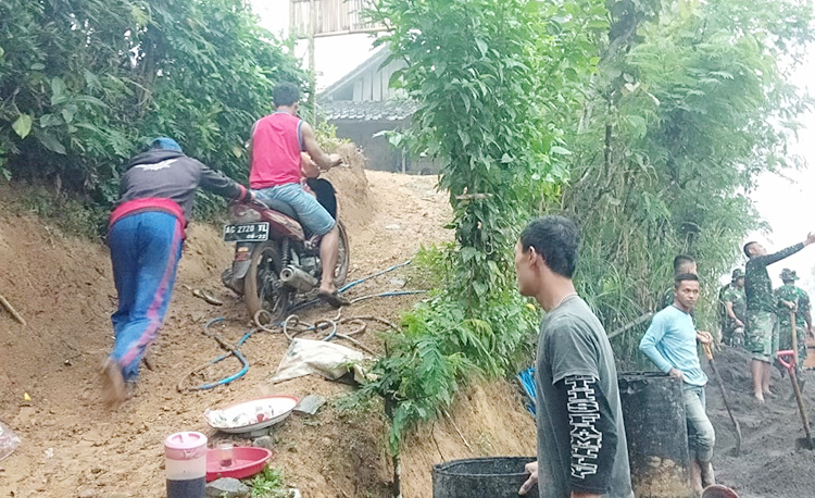 Seperti halnya yang dilakukan kepada Murtini 38 tahun warga RT. 18 RW. 08 Desa Dompyong Kecamatan Bendungan, yang kesulitan melintas usai membeli sembako dari daerah lain. Murtini yanh berboncengan dengan anaknya terpaksa harus turun dari kendaraan, karena beton cor masih basah. Kemudi motor digantikan Satgas TMMD sampai dengan titik jalan yang mudah untuk melintas.