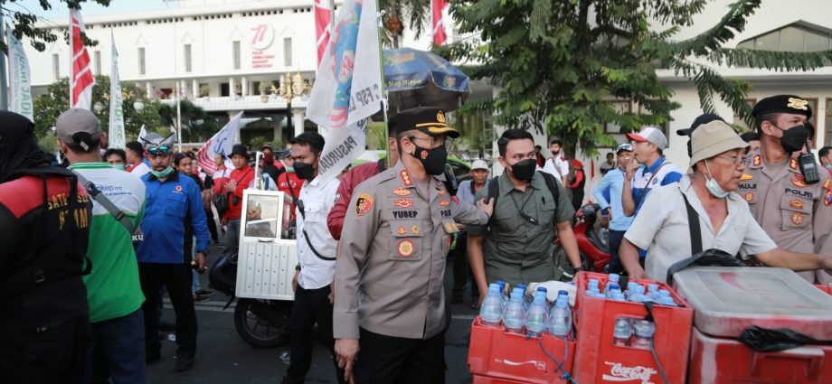 “Kami apresiasi pada rekan – rekan gabungan Serikat Buruh Jawa Timur,dimana kegiatannya dapat kita kawal sehingga aksi penyampaian pendapat berjalan dan aktifitas masyarakat bisa bergulir,” ujar Kombes Pol Akhmad Yusep Gunawan saat meninjau pengamanan.