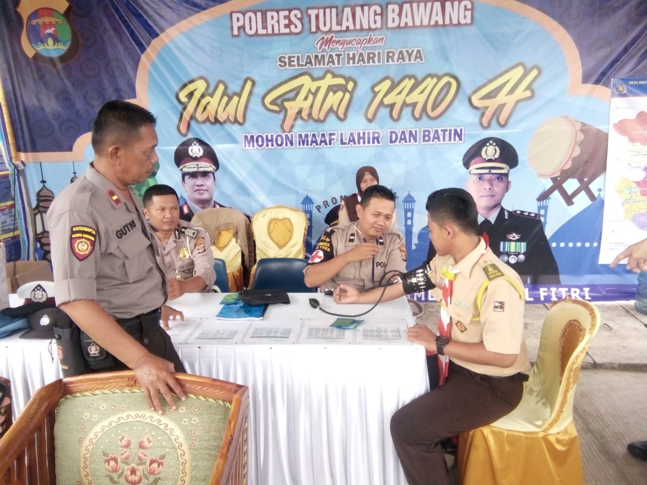 Tulang Bawang (PBO) – Urusan Kedokteran dan Kesehatan (Ur Dokkes) Bag Sumda Polres Tulang Bawang yang tergabung dalam Sub Satuan Tugas Bantuan Operasi (Subsatgas Banops) pada pelaksaan Operasi Ketupat Krakatau 2019, melakukan pemeriksaan kesehatan kepada petugas yang berdinas di Pos Pengamanan (Pos Pam).