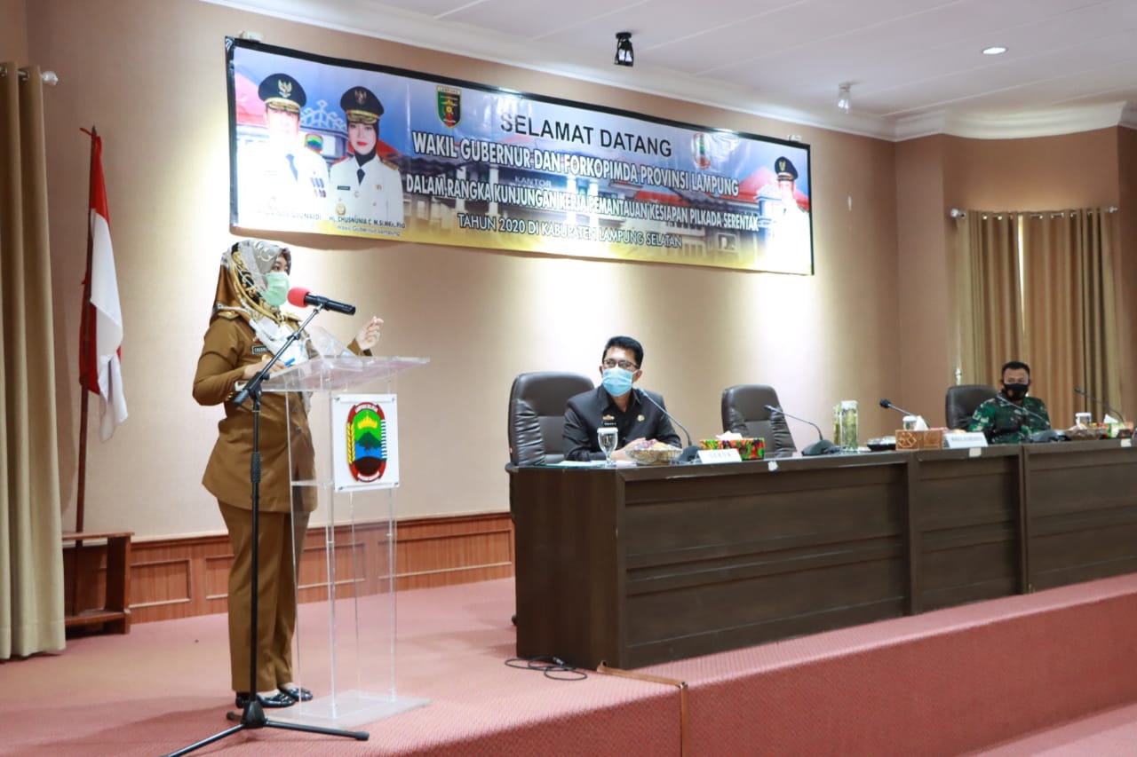 Kalianda, (Pena Berlian Online)- Wakil Gubernur Lampung, Chusnunia, bersama Jajaran Forkopimda Provinsi Lampung melakukan Kunjungan Kerja Ke Pemkab Lampung Selatan Dalam Rangka Pemantauan Kesiapan Pelaksanaan Pemilu Kepala Daerah Serentak di Kabupaten/Kota Provinsi Lampung Tahun 2020, bertempat di Aula Krakatau Komplek Perkantoran Pemkab Lampung Selatan, Senin (14/09).